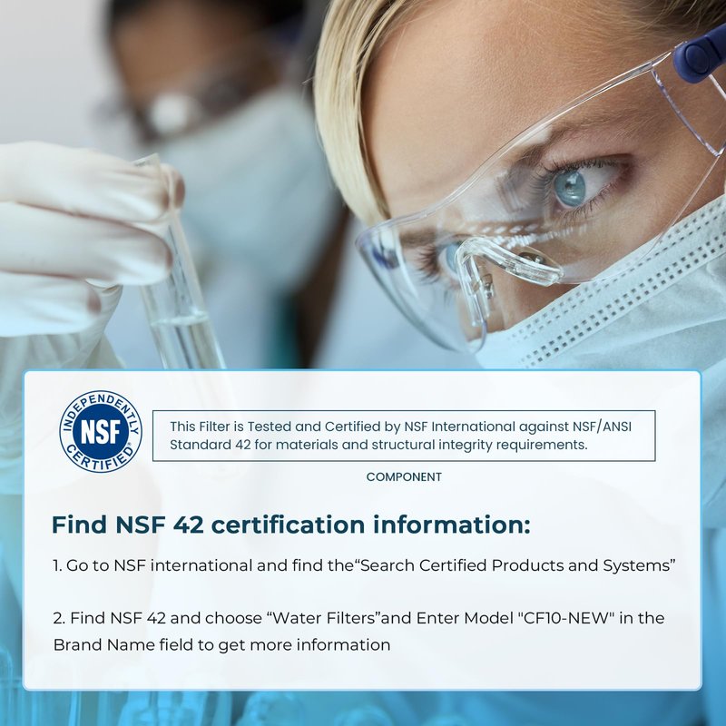 - Crystala CF16 LT1000PC Water Filter Statement: The materials and construction are in compliance with the NSF42 standard. After our laboratory tested, refrigerator water filter to remove 97.9% chlorine and improves water’s smell and taste. Find NSF 42 Standard information: Go to NSF’s database, enter the certified model number “CF16” or manufacturer "Ningbo Pureza Technology, LLC". If you find that the product is not NSF42 certified, you can claims identified in the NSF listing.
