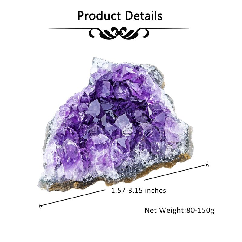 - Specifications: 1.57-3.15 inches. Material: natural amethyst crystal. Weight: 80-150g. Package: 1x amethyst crystal geode. Due to the nature of gemstone, carving may slightly vary in size, color and shape, each amethyst crystal cluster is unique, vary from lot to lot.You will receive the similar one as the picture showed