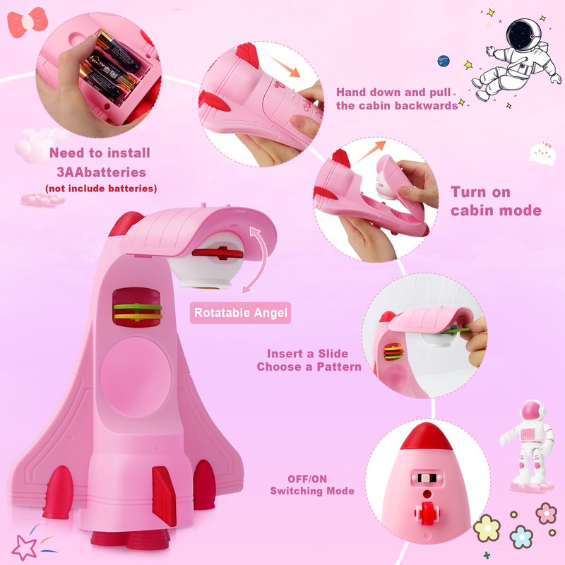 - 5【Best Gifts for Kids 3+ Years】The shape is Rocket Ship Toys with an Mini Bendable Astronaut Figurines. Make play time fun with this cute projector, this will help and encourage children to learn draw and paint while having fun. And ideal children's gift for Christmas, birthday, New Year and other holidays or festivals.