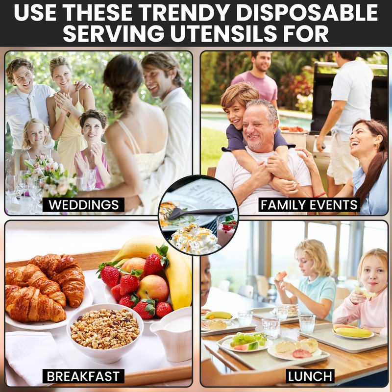 - Disposable: Use these trendy disposable serving utensils for weddings, family events, affairs, breakfast, lunch, dinner, or desserts to conveniently eliminate any washing dishes. This serving spoons for buffet set saves time and cleanup is a breeze so you can free up your time for yourself to spend it with friends and family without forgoing on elegance and style.