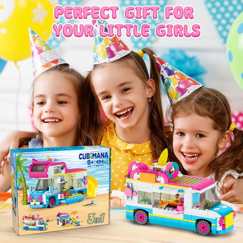 - Girls Building Blocks Set - This girls building toy set can be put together as a cute campervan, or a beachfront store, or an ice cream truck. Each building block set will let your child to build a large car/shop model as well as matching cute little accessories. amusing stickers and lots of amazing details! This diverse and fun building block toy set keep kids to use their endless imagination and embark on a wonderful journey of travelling