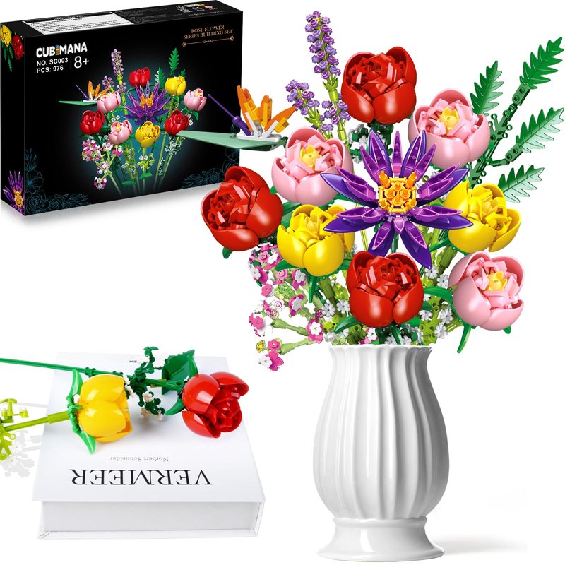 CUBIMANA Flowers Bouquet Building Set - Rose Flower Botanical Building Blocks Toy, Valentines Mothers Day Birthdays Gifts, Artificial Flowers Home Office Decor, Gifts for Adults Kids Girls Ages 8+