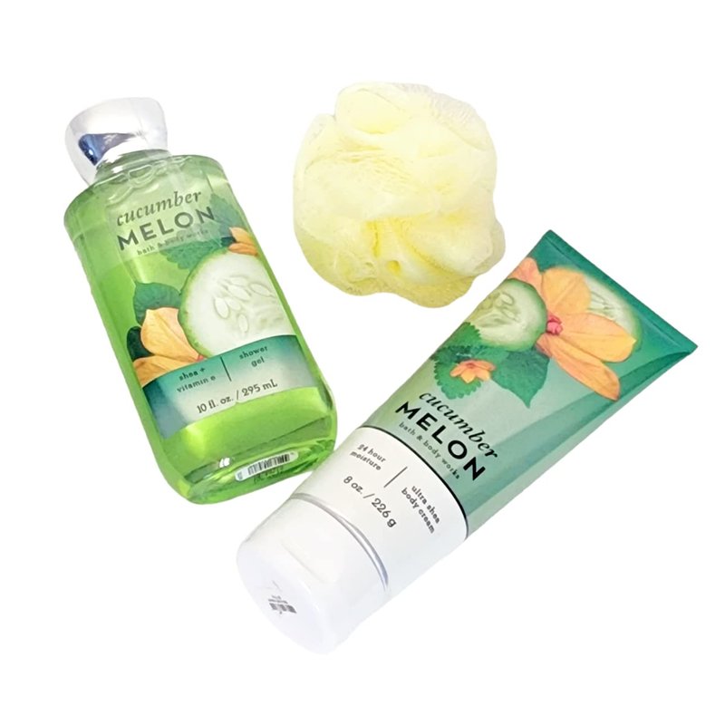 CUCUMBER MELON BATH AND BODY GIFT SET 4 PIECE GIFT SET BATH & BODY GIFT SET BODY CREAM BODY SHOWER GEL BATH FOAM 11 INCH BEAR VALENTINES GIFT SET MOTHER'S DAY GIFT SET BIRTHDAY GIFT SET WOMEN'S BODY GIFT SET CLEAR CELLO WRAPPED WITH RIBBON (COLOR MAY VARY)