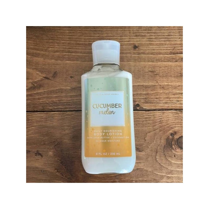 Bath and Body Works Cucumber Melon Lotion 8 Oz.. Scent: cucumber, honeydew, cantaloupe and grapefruit.. Ingredients: (vitamin E, shea butter and coconut oil) (Packaging may vary)