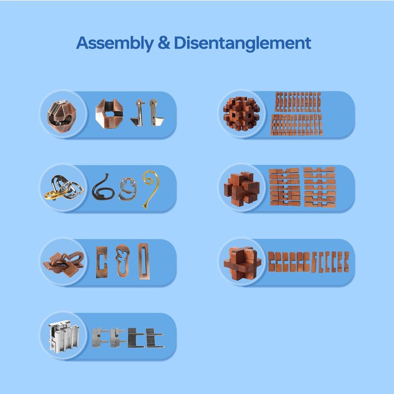 - Metal and Wooden Puzzle Toys Set: 3 sets Wooden and 4 sets Metal puzzles, the exciting brain teaser puzzles for adults, teen, and kids, puzzles provide for hours of entertainment, assembly puzzles and disentanglement puzzles, practice concentration.