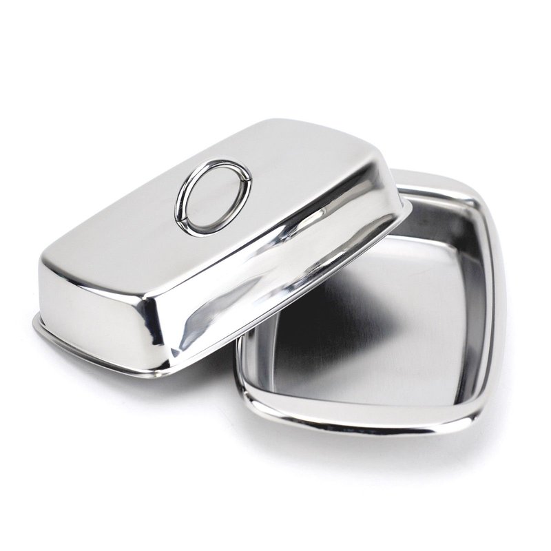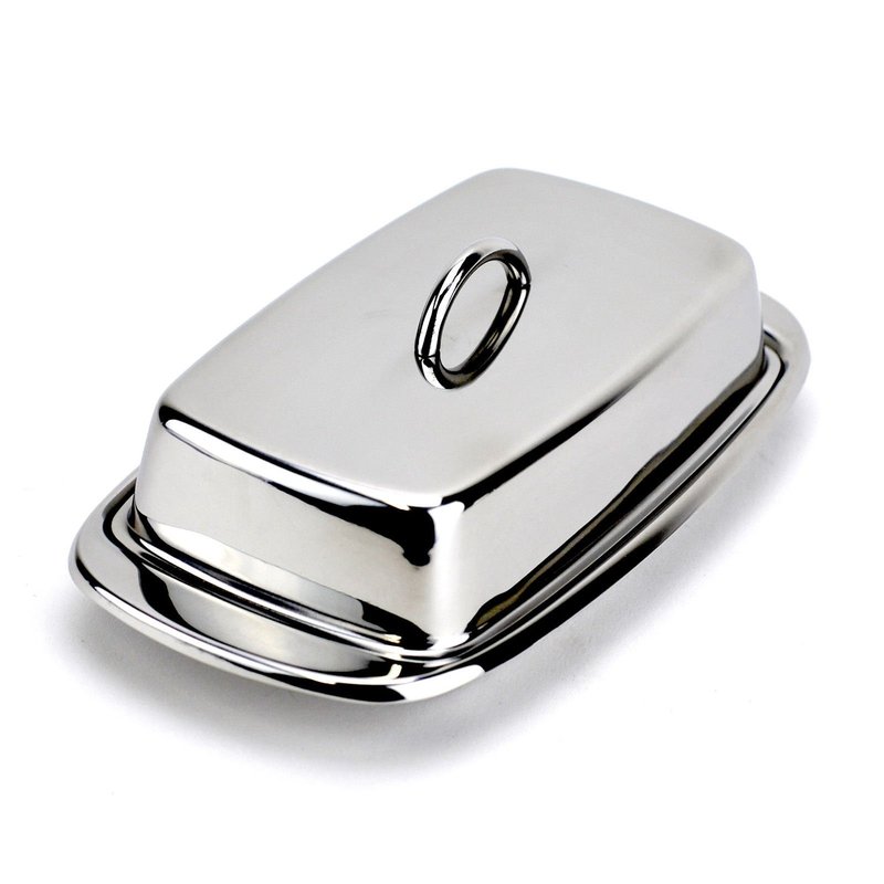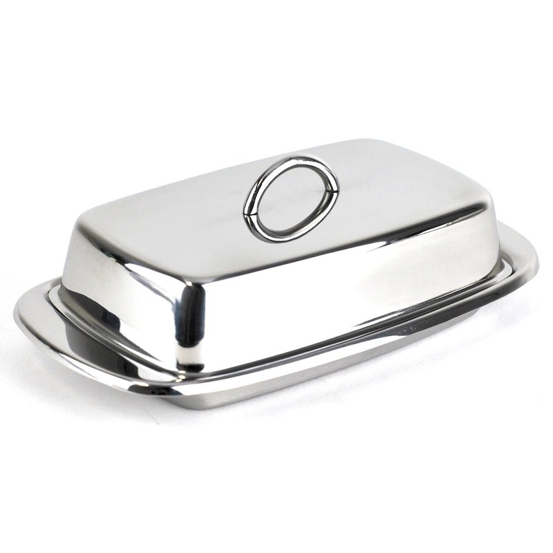 - Polished Stainless Steel dish can fit up to two sticks of butter, 1-pound of butter or a block of cream cheese