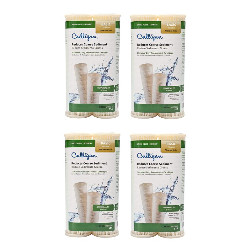 4 Pack, The Culligan S1A whole house sediment water filter replacement cartridge filters scale, rust particles, sand, dirt, & silt for basic filtration. The filter life is 4 months or 16,000 gallons. The filter has a 20 micron rating, pleated paper, For use with model #HF-150, HF-160, HF-360 and most standard size sediment filters. It also includes a change reminder sticker.