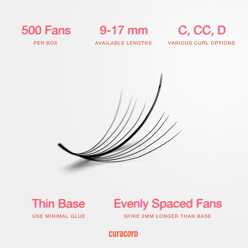 - WHY CURACORO PROMADE WISPY FANS — Handcrafted from premium PBT material, these wispy lashes are soft, dark, and sleek, with a petite base for easy application. Loved by lash artists around the globe, our Promade Wispy Fans deliver exquisite, wispy lash extensions with unmatched quality and performance. Trusted by experienced eyelash technicians worldwide, Curacoro Promade Wispy Fans set the bar high for creating stunning, voluminous looks.