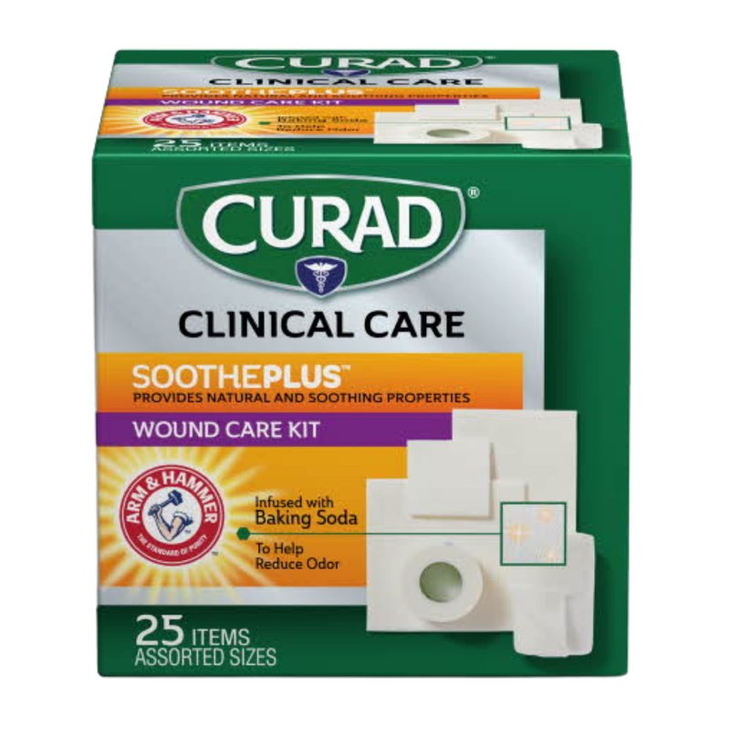 Curad SoothePlus Wound Care Kit with Arm & Hammer Baking Soda, Assorted Pack of Gauzes and Tape, 25 Count