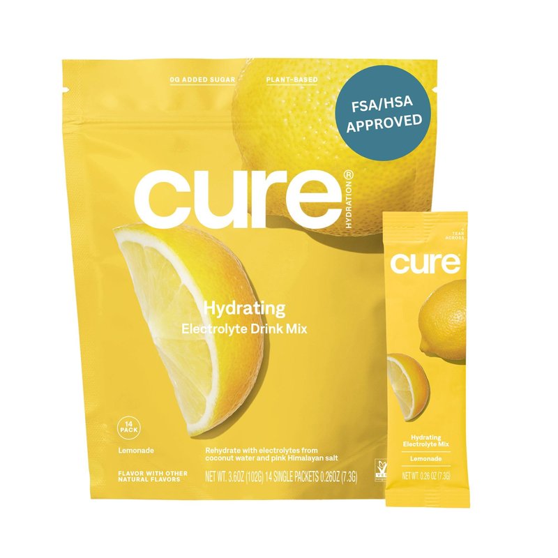 Cure Hydrating Plant Based Electrolyte Mix | FSA & HSA Eligible | Powder for Dehydration Relief | Made with Coconut Water | Non-GMO | No Added Sugar | Vegan | Paleo | Pouch of 14 Packets - Lemonade