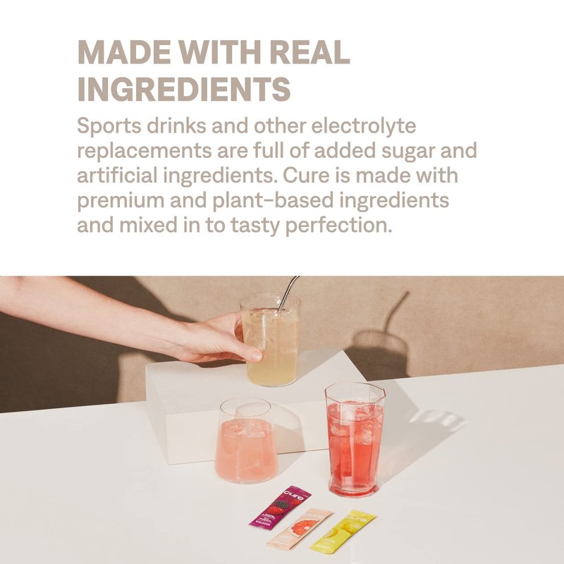- POWERED BY NATURE: Sports drinks and other electrolyte replacements are full of added sugar and artificial ingredients. Cure is made with premium and plant-based ingredients like coconut water and real fruit juices and has no added sugar.