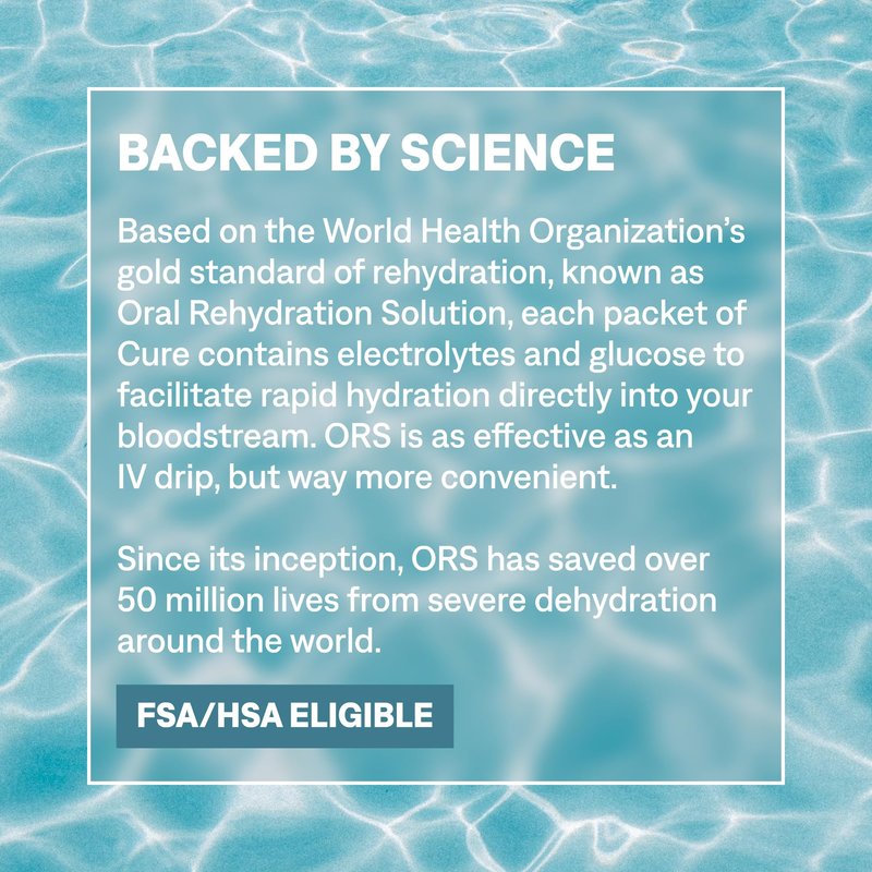 - RAPID ABSORPTION: Based on the World Health Organization’s gold standard of rehydration, known as Oral Rehydration Solution, each packet of Cure contains electrolytes and glucose to facilitate rapid hydration directly into your bloodstream. ORS is as effective as an IV drip, but way more convenient.