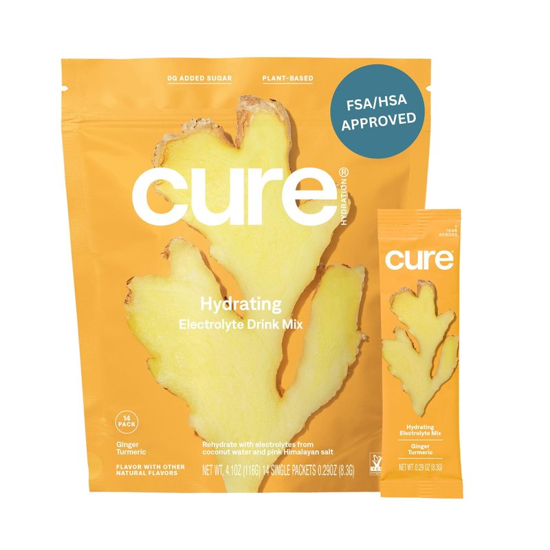 Cure Hydration | Plant-Based Electrolyte Drink Mix | No Added Sugar | Dehydration Relief Powder Made with Coconut Water | Non-GMO | Vegan | FSA & HSA | Pouch of 14 Packets - Ginger Turmeric
