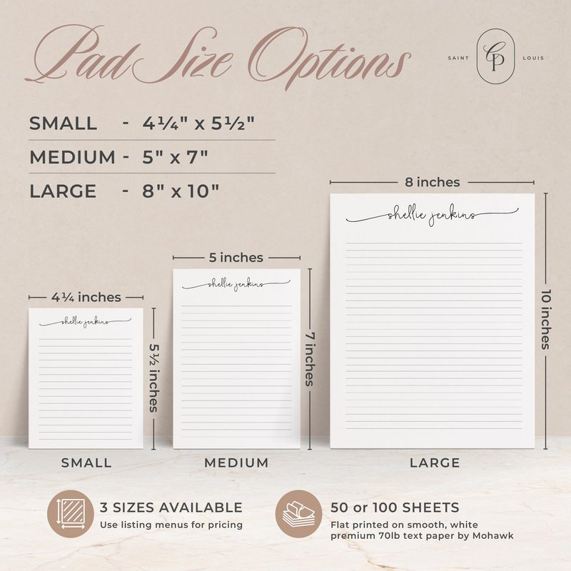 - THE IDEAL SIZE: Available as 50 or 100 printed sheets in three sizes – Small (4.25 x 5.5 inch), Medium (5 x 7 inch), or Large (8 x 10 inch) – choose the size and sheet count that works for you! Our Curio Press personalized notepad allows you to choose the size, and sheet count that suits your needs. Personalized note pads with name in all lowercase are ideal for adding a personal touch to your writing. Our personalized stationery notepads allow you to select the ideal style for any occasion.