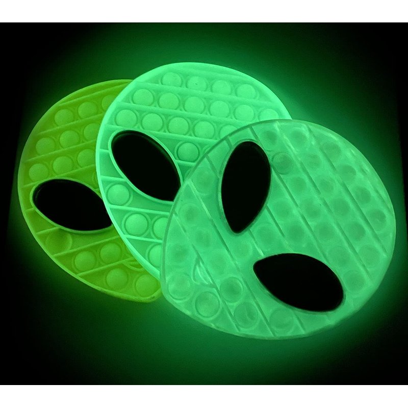 - Includes 1 Alien Head Shaped Bubble Pop Fidget Toy. Alien is 6.75" x 5.75", and has 31 bubbles. ALIEN GLOWS IN THE DARK!