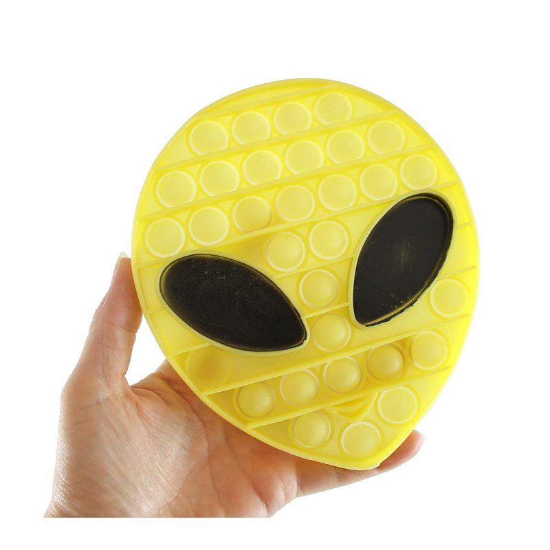 1 RANDOM COLOR ALIEN - This fidget toy is an alien head that is loaded with soft pop-able bubble buttons. You can poke and pop the bubbles multiple times making it a perfect fidget. Each alien is made of a soft and flexible silicone that has 31 bubbles. Poke the bubbles down and hear a little pop. Turn it over and pop them again! This fidget is a perfect never-ending game of bubble wrap! It is an easy fidget to take with you to school, work, or even in the car or airplane. Alien is 6.75" x 5.75". ALIEN GLOWS IN THE DARK!