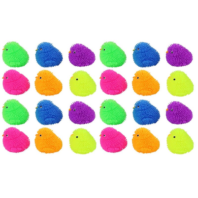 INCLUDES 24 CHICKS - These adorable chicks are tiny air-filled puffer balls. The chicks have soft rubber spikes and a super-squeezable texture. When you squeeze these puffer balls, an air bubble emerges from the interior. Chicks come in 6 colors and are 1.75" x 1.5". These toys would make a perfect addition to any Easter basket, classroom party goodie bag, or they would fit perfectly in Easter eggs for an egg hunt!
