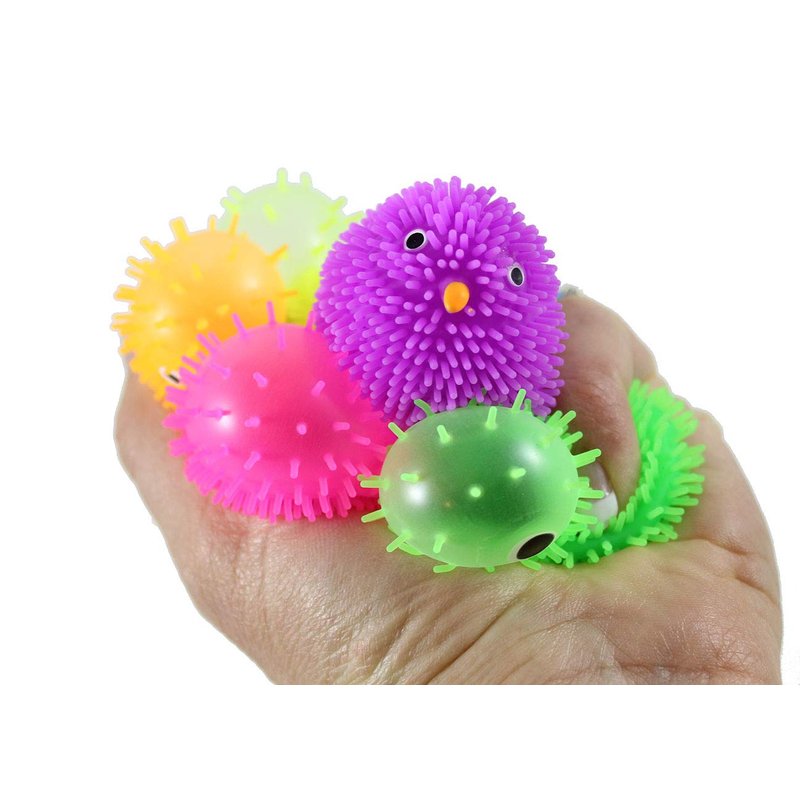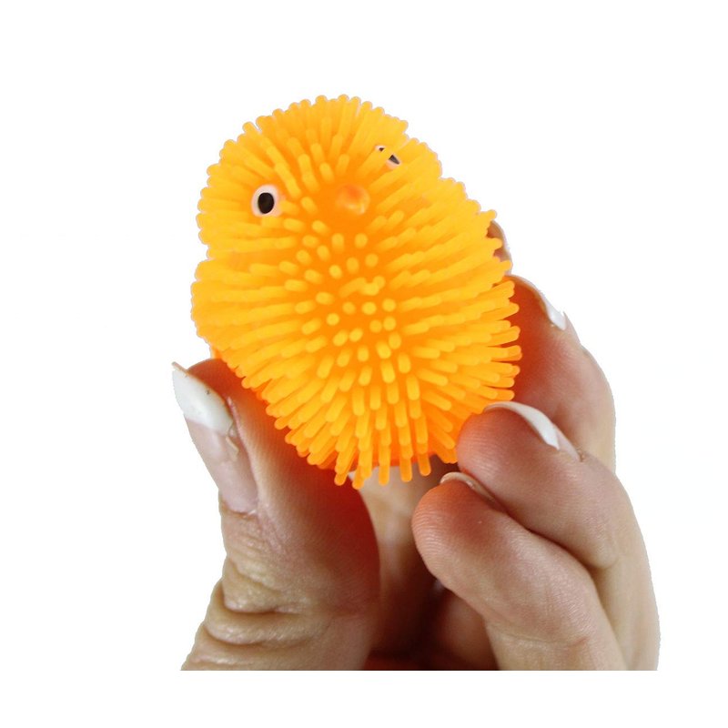 - The chicks have soft rubber spikes and a super-squeezable texture. When you squeeze these puffer balls, an air bubble emerges from the interior.
