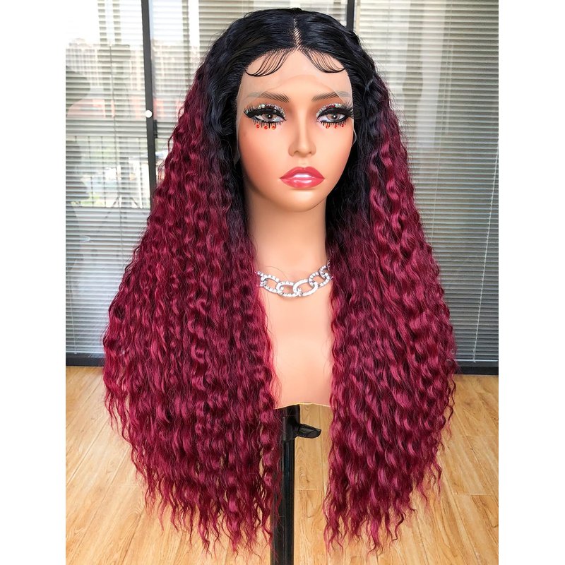 CURLCRAZY Long Curly Lace Front Wigs for Black Women Deep Wave HD Lace Frontal Wig Glueless Synthetic Lace Front Wig Pre-plucked with Baby Hair Dark Roots Hair(26" Ombre Red)