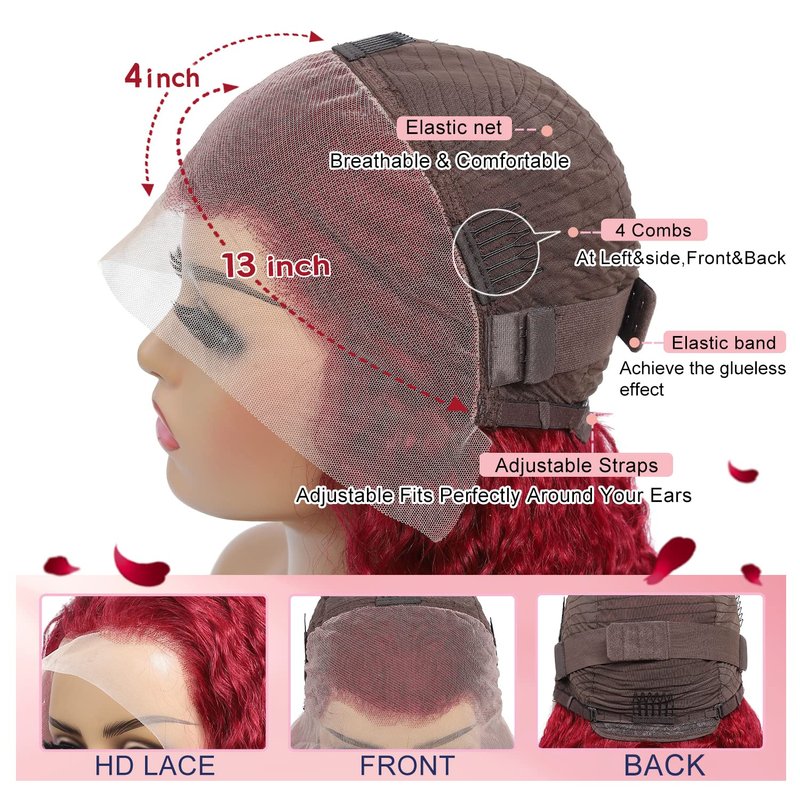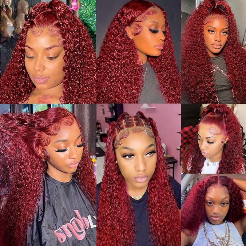 - 99J Burgundy 13x4 Frontal Wigs Human Hair Feature:10A Grade Curly Lace Front Wigs, It Looks More Native! 13X4 Deep Wave Red Lace Front Wigs 100% Human Virgin Hair. We also did the knot-bleached work to save you time.