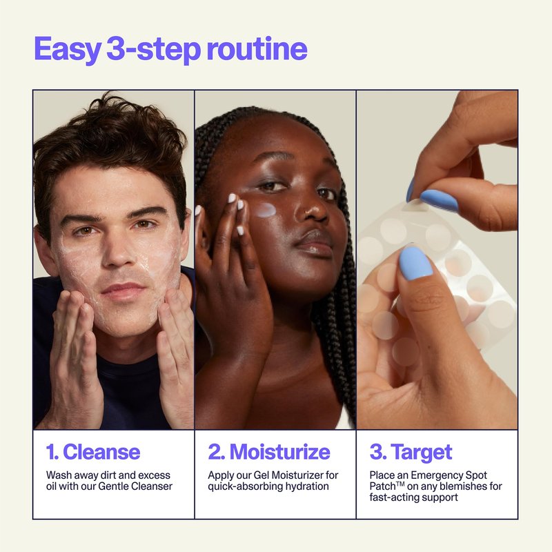 - CLEANSE, MOISTURIZE, TARGET – Wash away dirt and excess oil with our Gentle Cleanser. Apply the Gel Moisturizer for a quick-absorbing hydration boost. Target sudden spots with our fast-acting Emergency Spot Patches