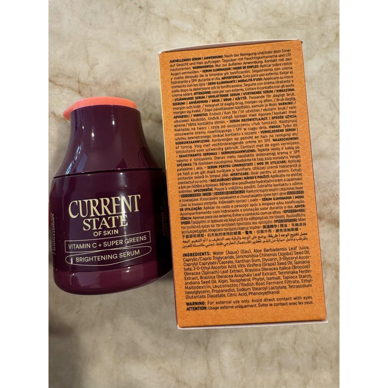 Introducing the Current State Vitamin C for Face Serum – your ultimate skin brightening serum that packs a punch of goodness in every drop! If you're on the hunt for a vit c serum that will transform your skincare routine, look no further. This skin brightening serum is designed to give your complexion that enviable glow and even out your skin tone. Our Vitamin C Face Serum is a lightweight, refreshing gel packed with good-for-skin vitamins and antioxidants. Enriched with a bold mix of greens, fruit extracts, and a powerful combination of two forms of stable Vitamin C, this serum is your skin's daily vitamin shot. It's like a green smoothie for your face, brimming with the natural goodness of broccoli, spinach, and kale – all the nutrients your skin craves. The Current State Vitamin C Serum for Face is your go-to solution for combatting environmental damage and repairing damaged skin cells. It works diligently to reduce the appearance of sun damage and hyperpigmentation, making it an excellent dark spot correcting glow serum. Say goodbye to those pesky dark spots and hello to a brighter, more even skin tone! This vitamin c facial serum is not just about brightening; it's also a potent anti-aging serum that promotes collagen formation, helping to keep your skin youthful and plump. Whether you're looking for a face serum for women anti aging or a serum for face anti aging for men, this product fits the bill perfectly. It's the best vitamin c serum for face, delivering visible results that you'll love. Our vit c serum face is also vegan, making it a fantastic choice for those who prefer vegan skin care products. Using the two most stable forms of vitamin c, Ascorbic Acid and Ascorbate vitamin c it ensures maximum potency and effectiveness. Plus, it's suitable for all skin types – whether you have oily, dry, or combination skin, this serum for face works wonders.