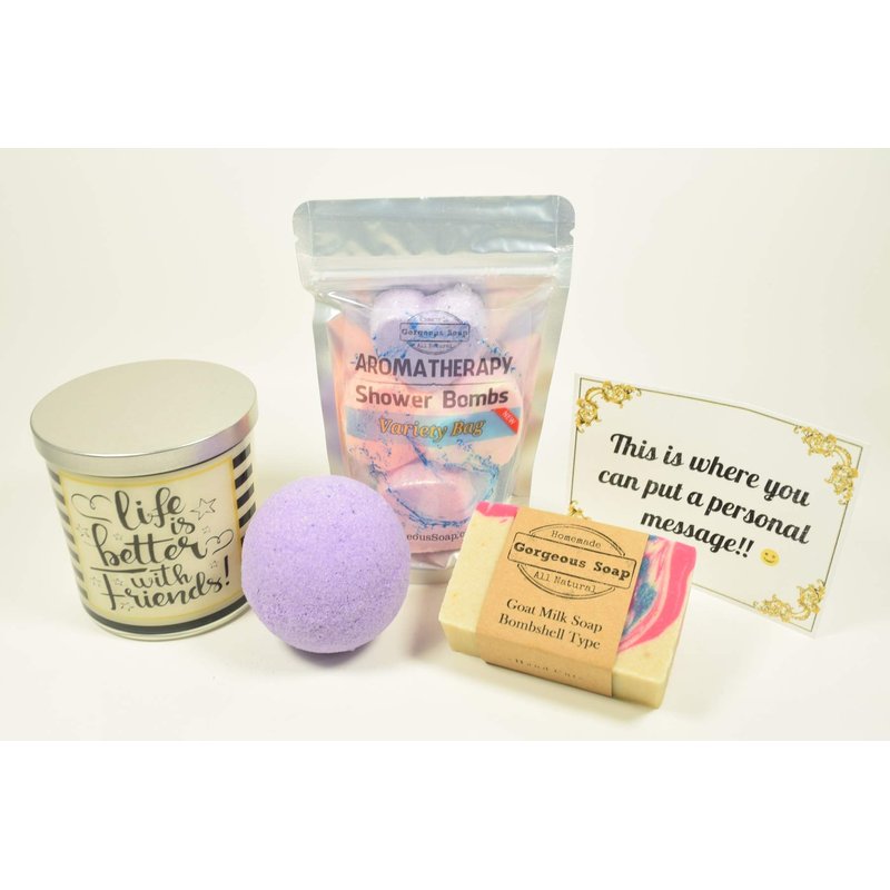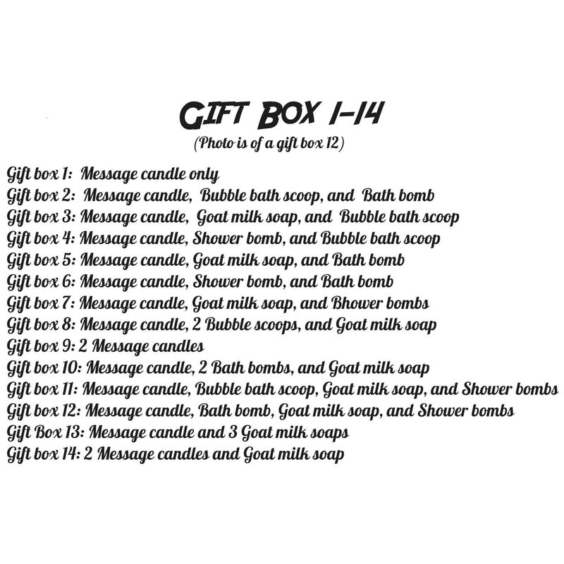 Gift box 12: message candle, bath bomb, goat milk soap, and shower bombs