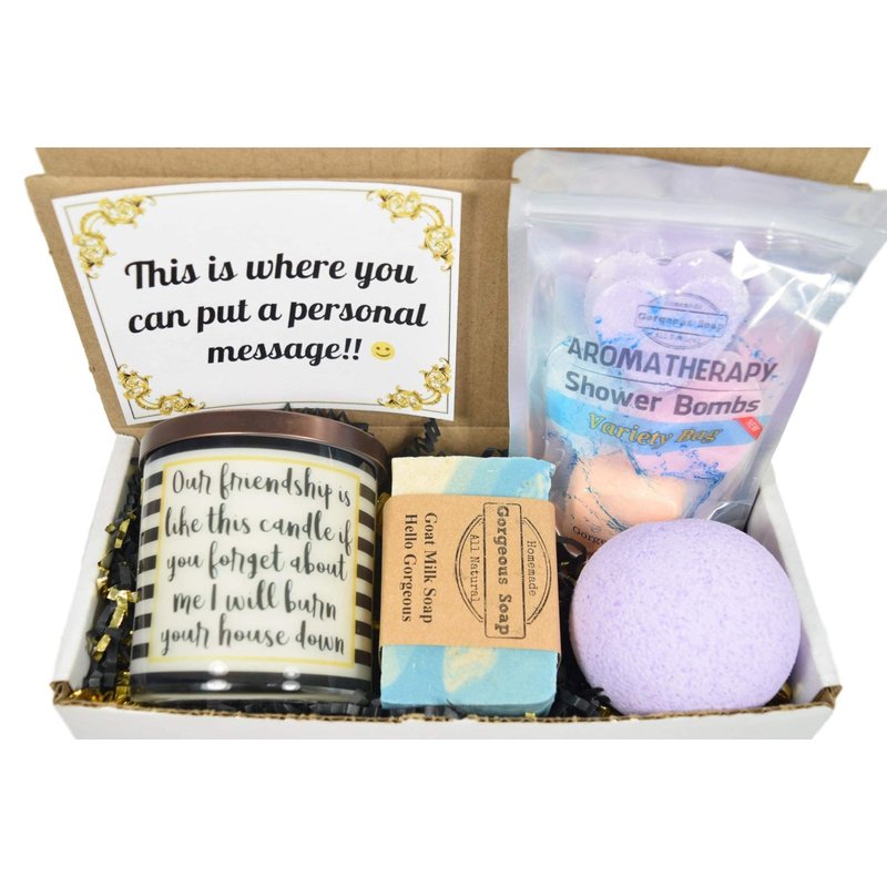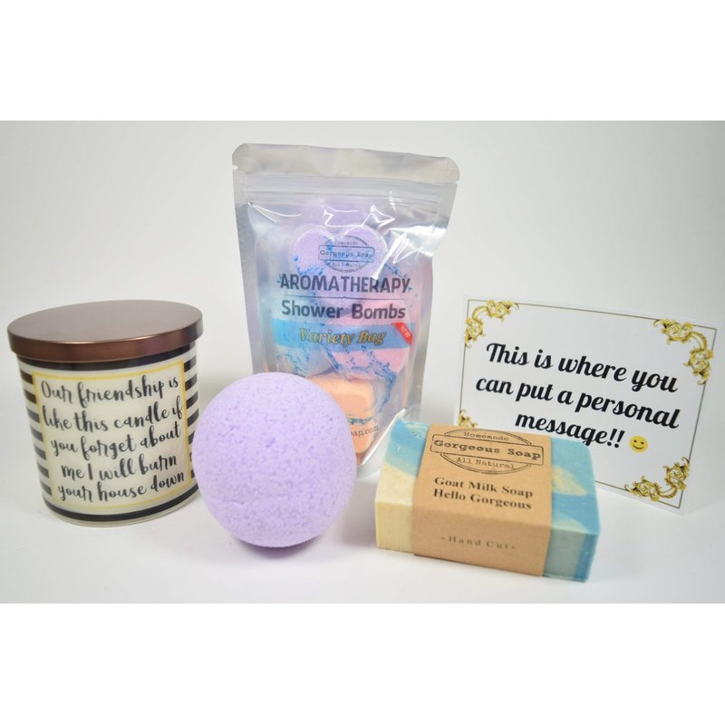 Gift box 11: message candle, bubble bath scoop, goat milk soap, and shower bombs