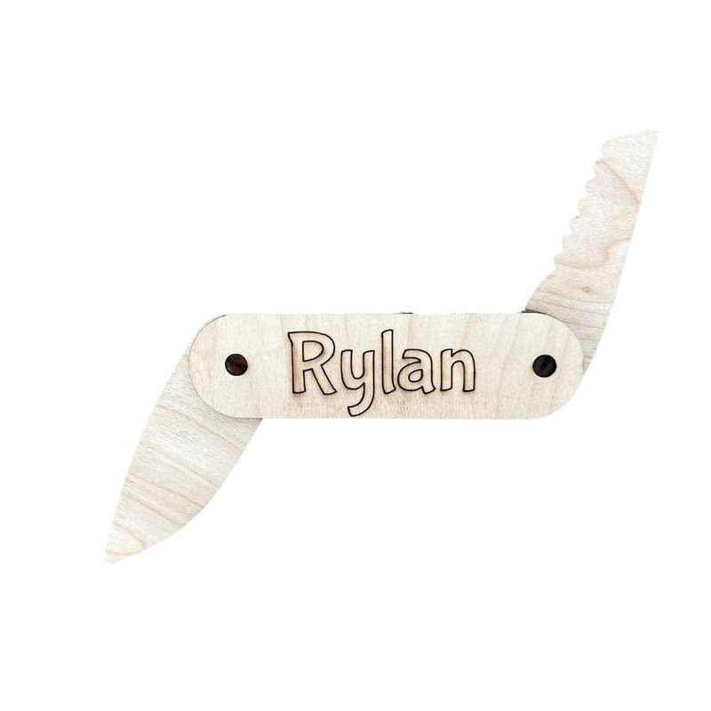 A fun pretend pocket knife that can be personalized with a word or name The Custom Pocket Knife is a fun Wooden Toys Folding Knife. Make sure to get your Engraved Knife with a name A great gift for kids for pretend, husbands for father's day, and the other special men in your life as a fun little gift Gift ideas for step dads, father in laws, husbands, dads, kids, boys, girls, groomsmen, boyfriends, and many other people in your life. measures 1x1x4 inches. Can be personalized with your own name or word on top of the pretend wooden knife Includes a pretend saw blade and a pretend straight blade. The knife blades move in and out of the case like a real swiss army knife.