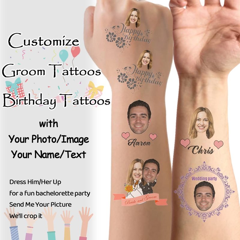 - THE BEST CHOICE: The most creative and funny custom face tattoo for birthday party or bachelorette party! We supply a variety of styles for you to select, with popular elements. Any graphics can be customized a tattoo as you please. We recommend kid face, wife face, husband face, boyfriend face, girlfriend face, couple face, single face, dog face, cat face.