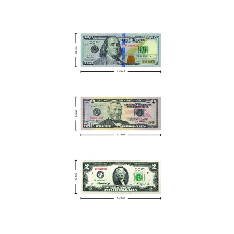 - 3 BUNDLES OF PLAY MONEY STACK - Each Set contains 10 pieces $100, $50, $ 2 Mini Fake Money Paper Bills (Total of 30 Pieces). They are the closest copy you can find in the real thing – it’s just that it comes in a super cute size! Not real currency!