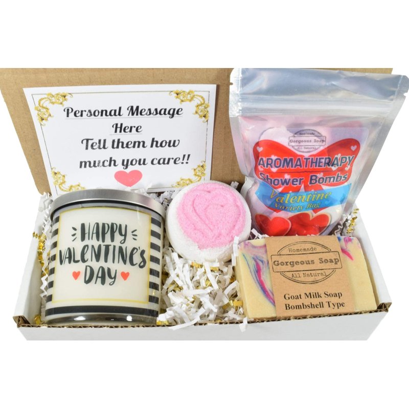 ** Send us your personalized gift message if you're wanting one. Click the link to contact seller** Choices to include in the Handcrafted Valentine Gift Box: * Handmade goat milk soap bar * Natural soy candle with a message label * Variety pack of 5 aromatherapy shower bombs * Bubble Bath Scoop. or Bath Bomb.