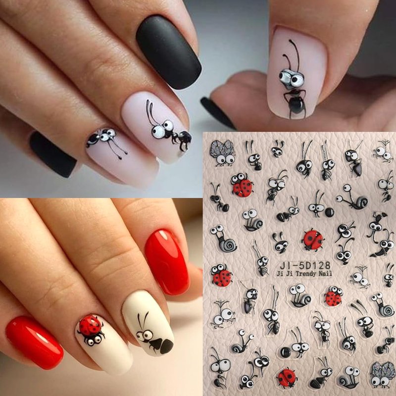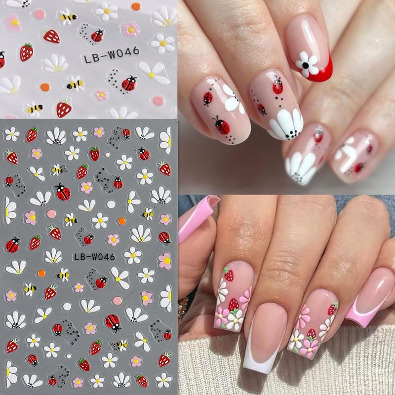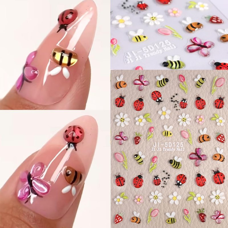 - 【You Will Get】 4 sheets 5D embossed self-adhesive nail stickers with plenty of cute designs, including bee, ladybug, ant, flowers, butterfly and strawberry, which can offer you multiple choices, satisfy your rich imagination of nail DIY and create your own nail style.