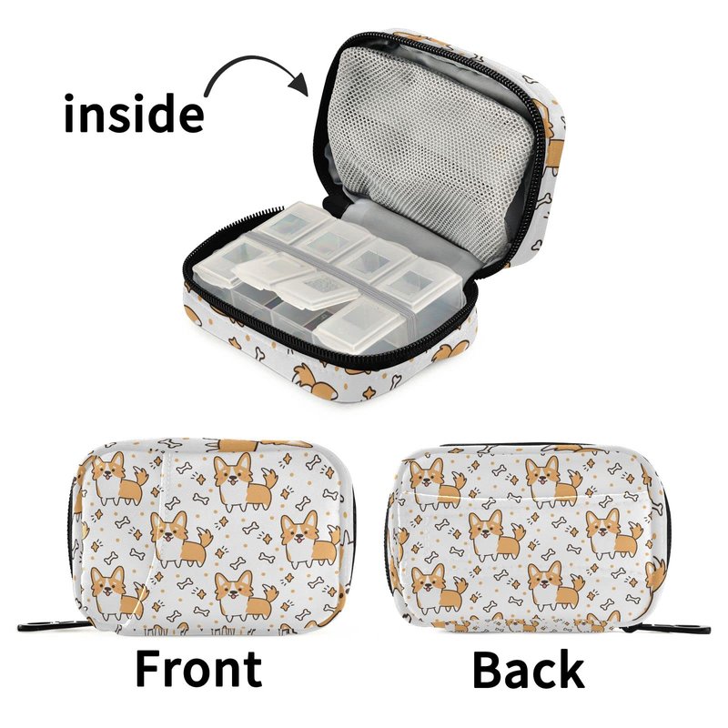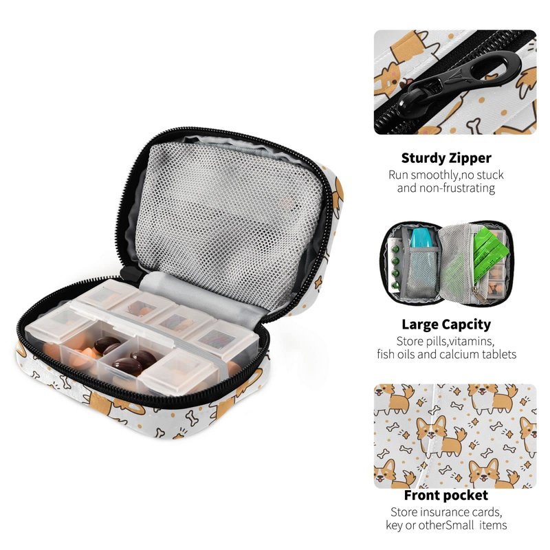 Cute Corgi Dog Pill Organizer Case Yellow Puppy Bone 7 Day Travel Pill Box with Zipper Portable Weekly Vitamin Medicine Supplement Holder Pouch Bag