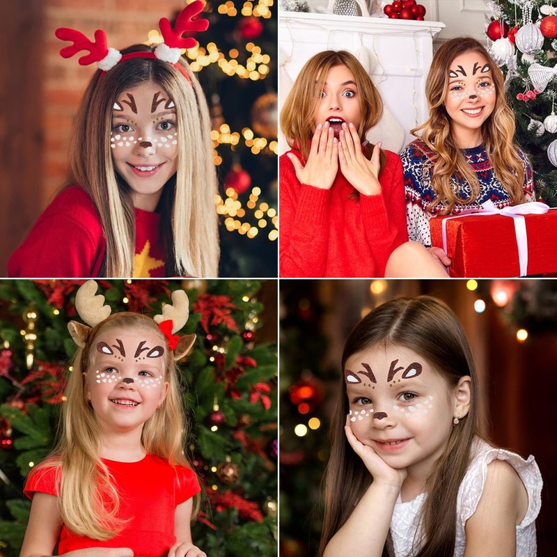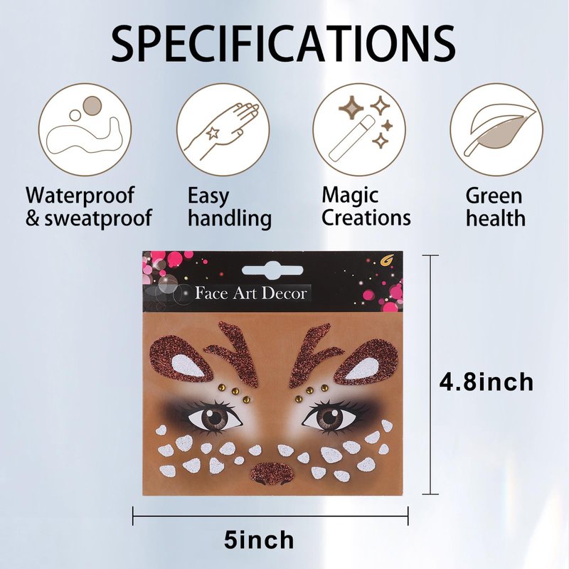 - 𝐂𝐡𝐫𝐢𝐬𝐭𝐦𝐚𝐬 𝐃𝐞𝐬𝐢𝐠𝐧:This Christmas face sticker adopts the pattern of a deer prototype. It has long brown antlers and ears, as well as white spotted deer skin . Perfect for adding a touch of holiday cheer to your Christmas cosplay costume.