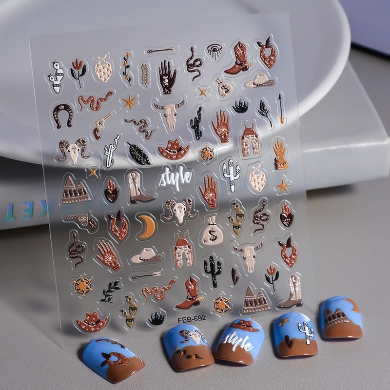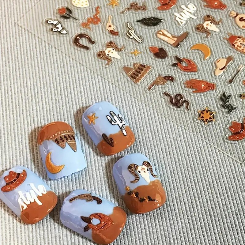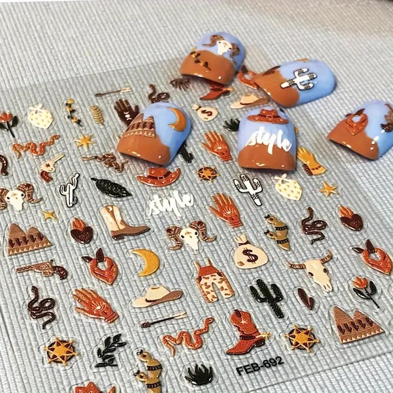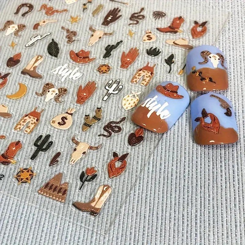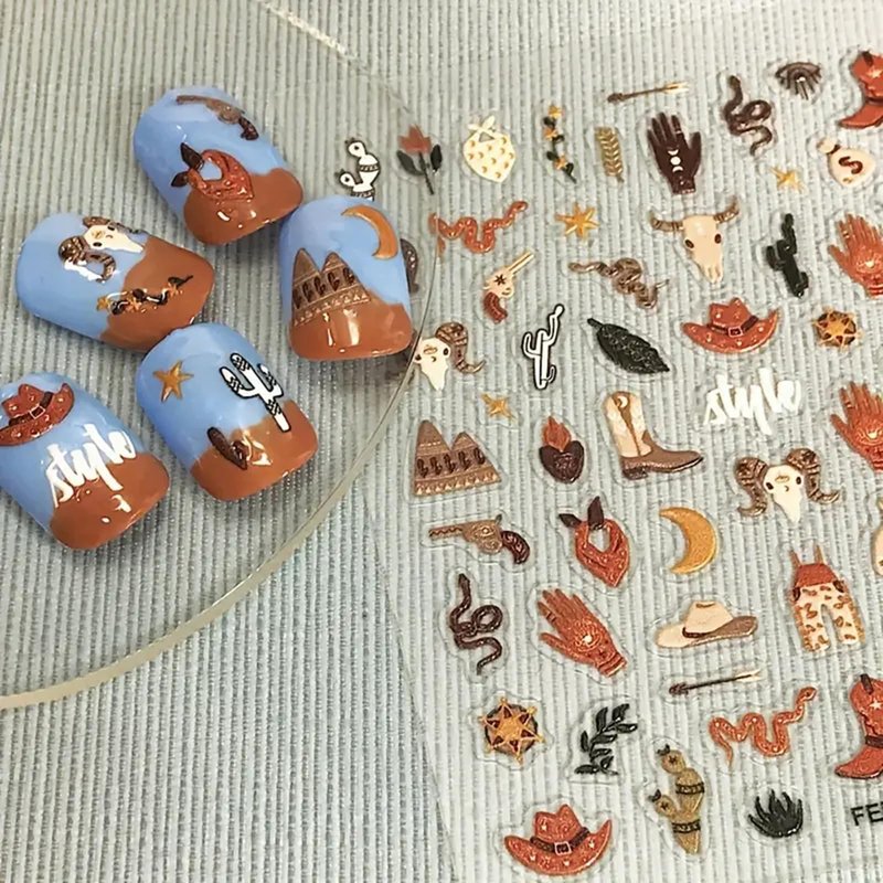 Cute Nail Art Stickers Exotic Nail Decals 5D Adhesive Nail Supplies Snake Cowboy Clothing Cow Money Bag Bohemian Style Design Cowboy Desert Cactus Nail Stickers for Women Girls Nail Art Decoration