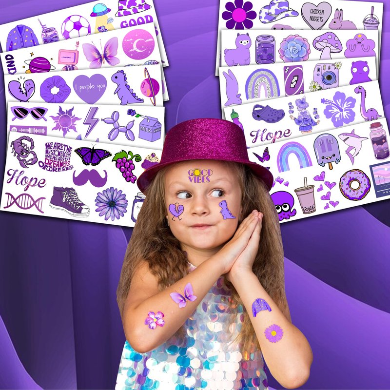 - What You Get: We would like to provide you with ten sheets tattoos for you, including various styles, sufficient in quantities and styles to meet your daily requirement of using and decorating. Children can easily use this set of Cute Purple party decorations with this Purple Violet temporary tattoos and take unique photos to make fond memories. The size of each sheet is 6.1 * 3.1 inches.