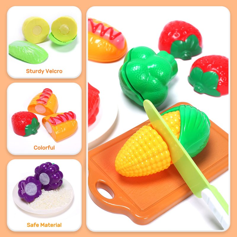- Realistic Cutting Play Food for Toddlers: Each play food item features Velcro attachments, allowing kids to "cut" foods like steaks, strawberries, and other fruits and vegetables in half. The detail design even allows for peeling peas and bananas, adding an extra level of fun to the play experience