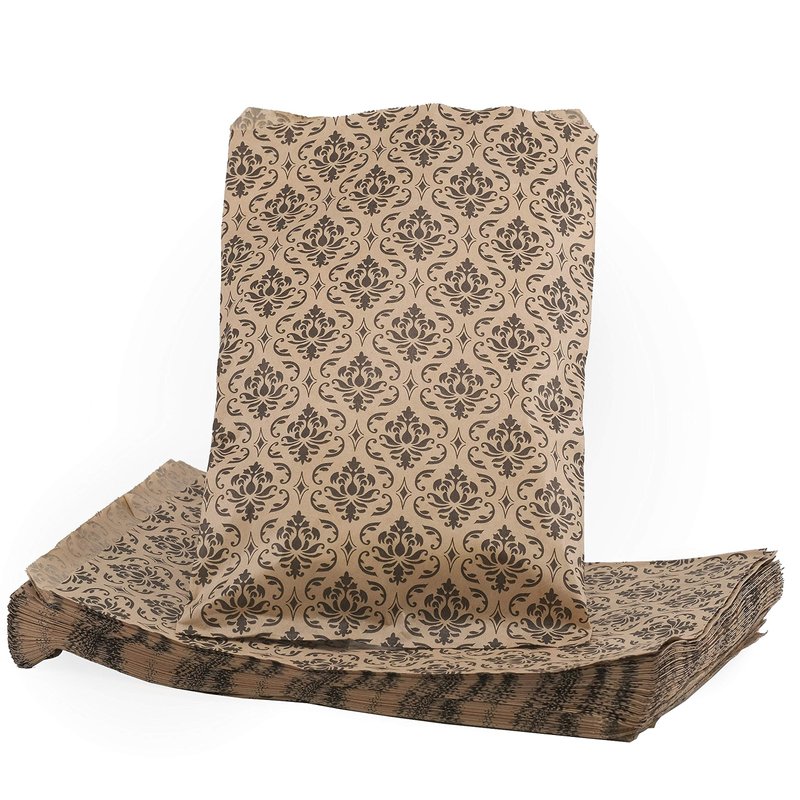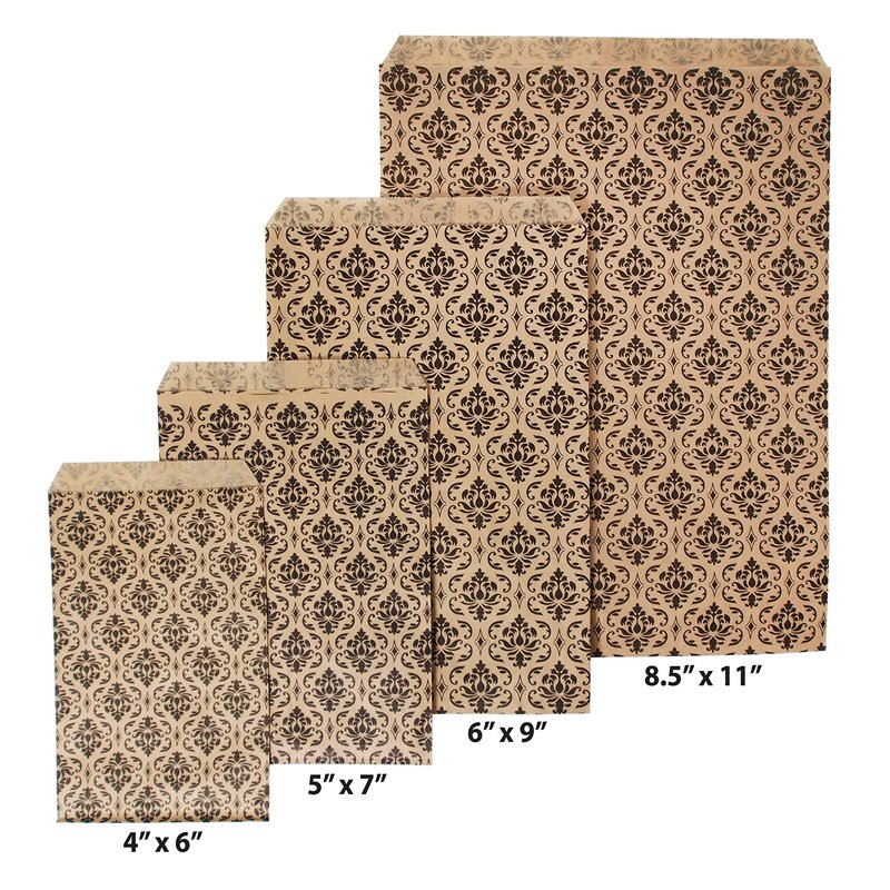 Do you love the look and feel of kraft bags but think they’re a little too plain? Or maybe you're worried they look a bit too much like lunch sacks? Change things up with our Damask design line of paper gift bags. Inspired by historic patterns originating in the Middle East, they’re a fun twist on a classic bag. These bags are available in 4 different sizes: 4 x 6, 5 x 7, 6 x 9, and 8.5 x 11 inches. Our smaller bags are perfect for things like trinkets, baked goods and party favors while our larger sizes can be used for bigger items like books and clothing. We offer packs of 100, 200 and 300 to suit a variety of needs. The intricate, deep black patterns are sure to grab the attention of family, friends and customers. These bags have no gusset, allowing them to lie as flat as your choice of filling will allow, which makes them perfect for table settings or display cases. The kraft base means that these bags look great on any background and work just as well for merchandise as they do for birthdays, weddings, and outdoor events.