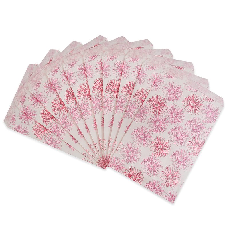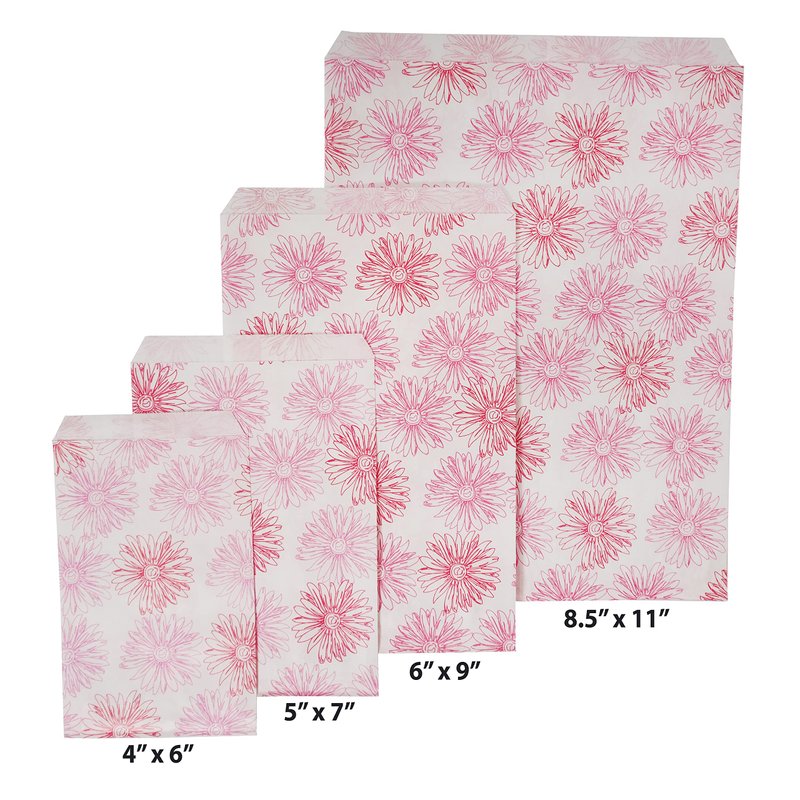 These CuteBox Pink Flower patterned flat paper gift bags are a great choice for any retailer, party thrower or dedicated collector of flat paper gift bags. The eye-catching design is sure to draw attention from your family, customers, and friends. The 4 different sizes (4” x 6”, 5” x 7”, 6” x 9”, 8.5” x 11”) allow the bag to hold a wide variety of items, everything from jewelry boxes to baked goods to whatever party favors you have planned! We offer these bags in a variety of quantities to cater to your individual needs. Those who are having small events at their homes might prefer our 100 pack, while retailers who need them in bulk might gravitate towards our larger offerings. Each bag is coated with a semi-gloss finish for both aesthetics and to provide minor protection from tearing and piercing. These bags have no gusset which allows them to lie as flat as your choice of filling will allow, making them perfect for table settings or on top of display cases. The white bag base means these are perfect for any occasion, and the Pink Flowers work especially well in Spring and Summer!