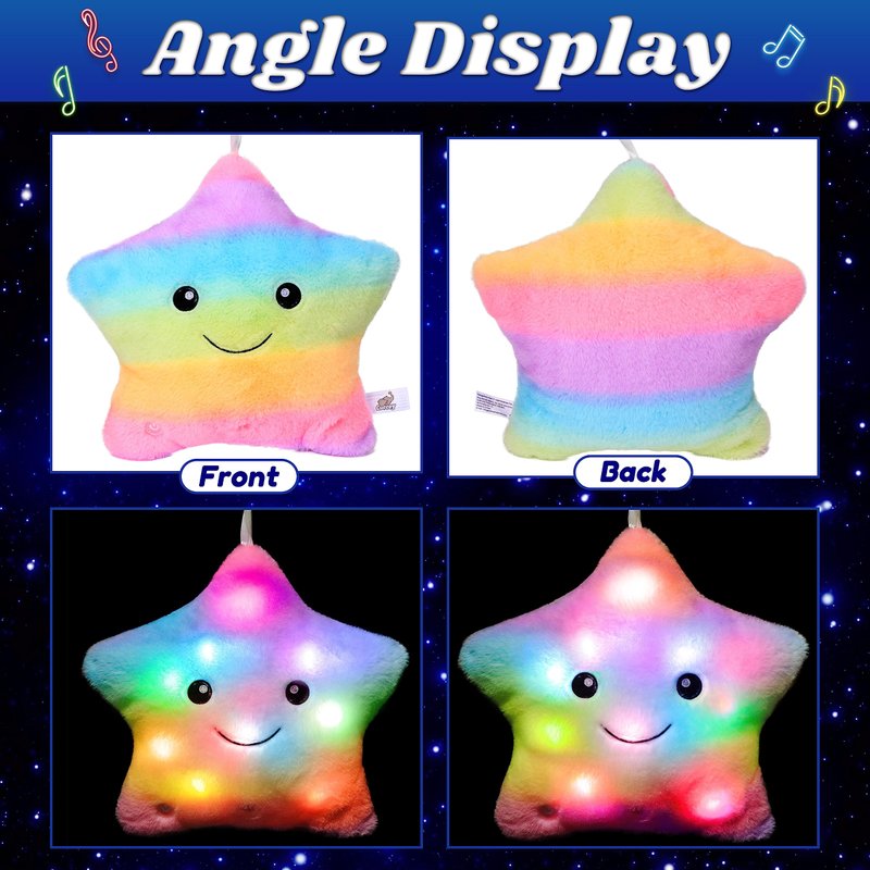 - STAR PILLOW SINGS: This soft LED musical star can sing! When you press the button on the right, it will change the song! All these soft songs can soothe children's mind and accompany them to dreamland.