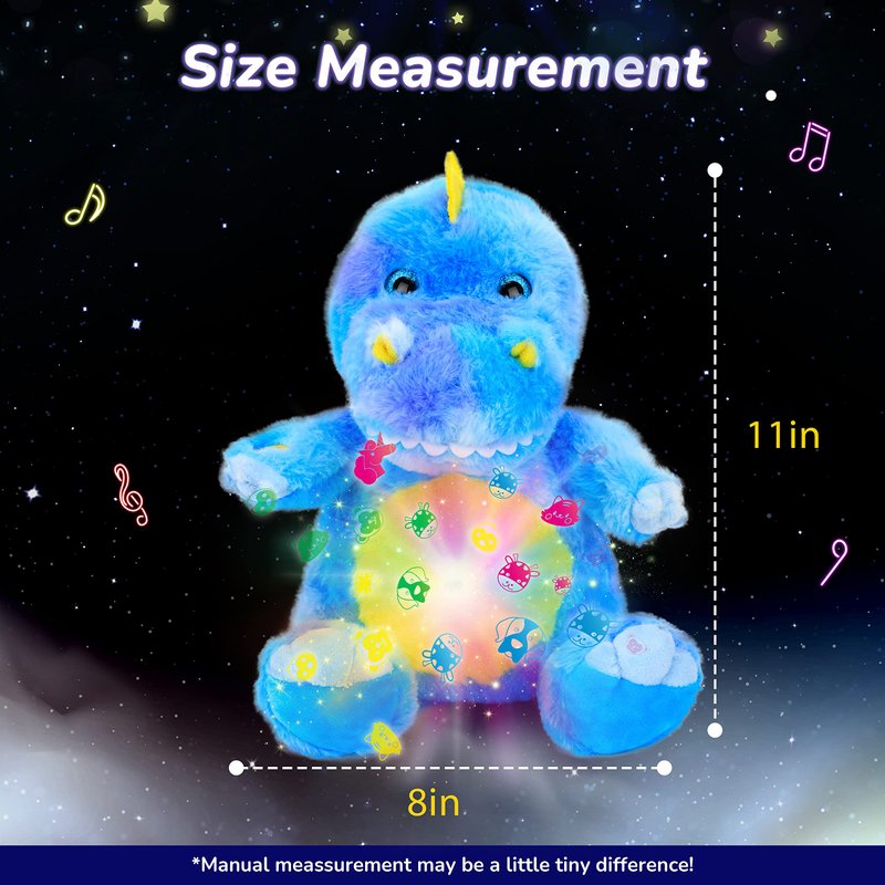 - Nightlight Star Projector: A star projector designed for dinosaur lovers! This cute dinosaur plush toy has an tummy and is designed for children's bedrooms with soft lighting that projects stars and the moon. Features color-changing projections and instrumental lullabies.