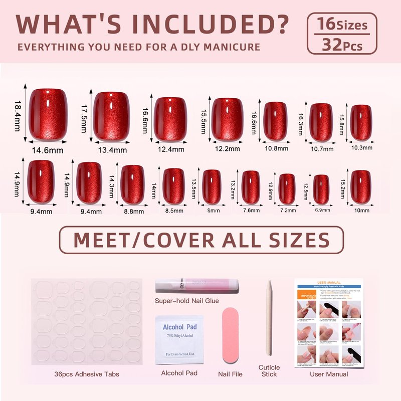 CUZIAM Press on Nails Short Square, 32pcs Wine Red Mirror Cat Eye Soft Gel Nail Tips with Glue, 16 Sizes Glossy Reusable Comfortable Gel Salon Manicure Stick on Nail Christmas for Women Girls-Love Red