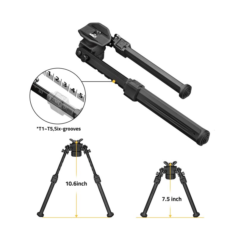 - Six-level Height Adjustment: The bipod's compact size and folding capability also make it convenient for transportation and storage. The adjustable legs of the rifle bipod offer great versatility, from 7.5 to 10.6 inches. The pivot bipod locks into place with a satisfying click, ensuring a tight fit.