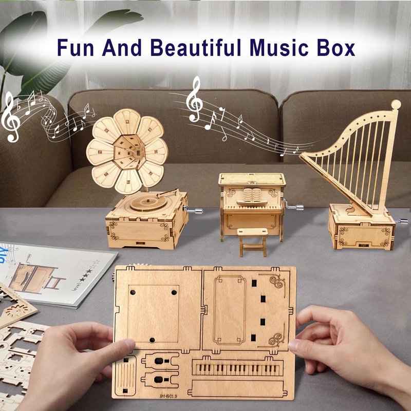 CYAZOO 3in1 3D Wooden Puzzle for Adults Music Box Set-Kids DIY Musical Instrument Model Assembly Puzzles Hands Craft Building Kits Home Decoration (3PCS: Gramophone+Piano+Harp)