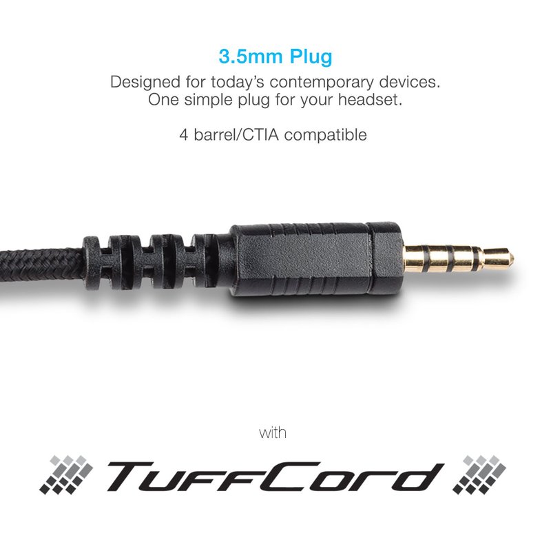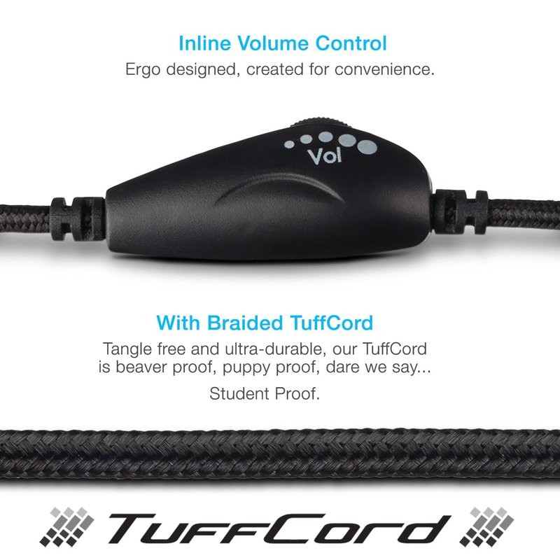 - Durable Design: Adjustable headband with easy to clean leatherette earpads. Headset and tangle free braided TuffCord cable are designed for hard wearing and to be long lasting.