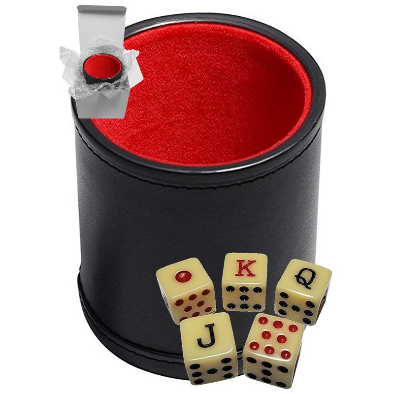 Cyber-Deals Set of Dice Cup Black PU Leather w/Plush Red Felt Lined + Spanish Poker Dice Bone Tone (Gift Boxed)