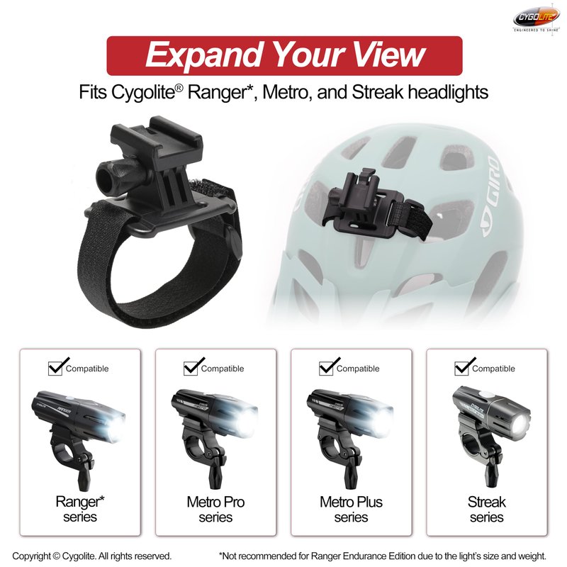 - Mount your Cygolite Ranger, Expilion, Metro, Streak bicycle headlights onto your helmet with this helmet mount kit.