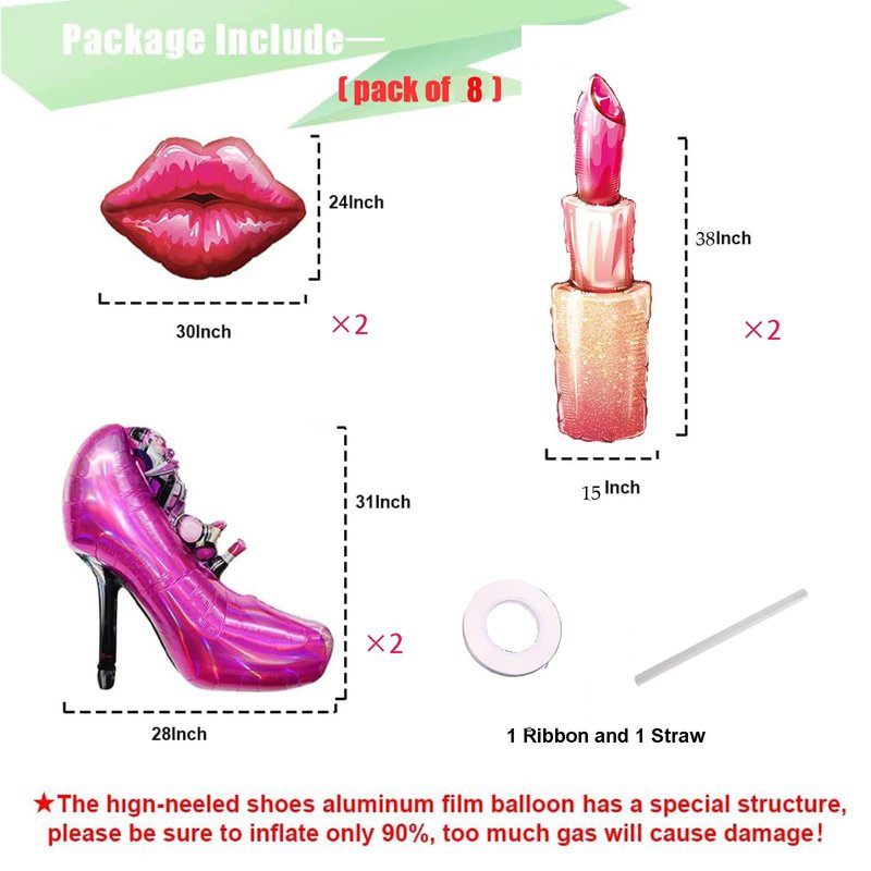 - Package includes :2 high heel balloons, 2 pink head balloons, 2 lip gloss balloons, and 2 lipstick balloons