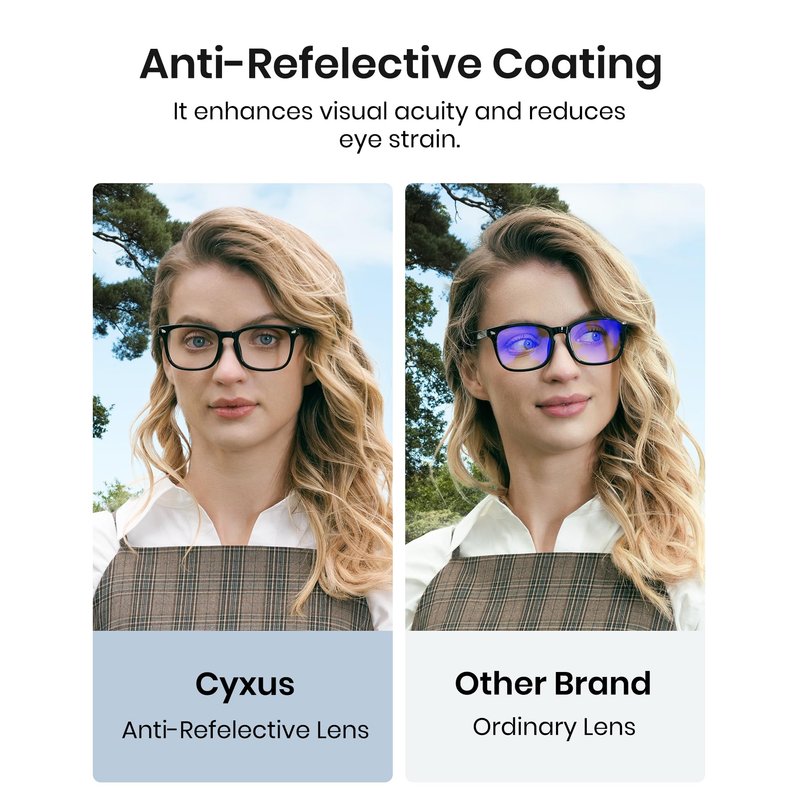 - 【HEV-Absorbed TECHNOLOGY】Cyxus blue light filter glasses lens are crafted from HEV-absorbed technology and radiation protection membrane, Anti-reflective membrane, Nano waterproof membrane. These blue light glasses for women can absorb the harmful blue light between 380nm and 450nm and release beneficial blue light. Square blue light glasses can prevent light reflection and avoid eye pain.